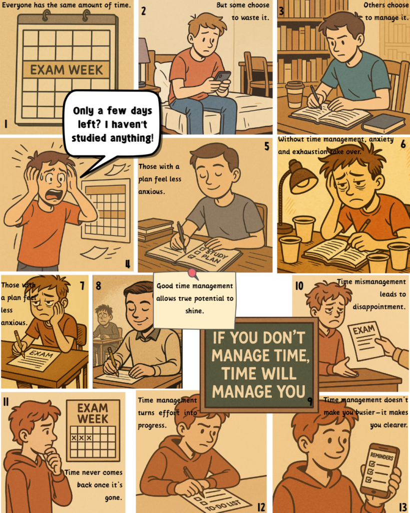 - Contrast: The comic visually compares unmanaged time with managed time, making the lesson clear.